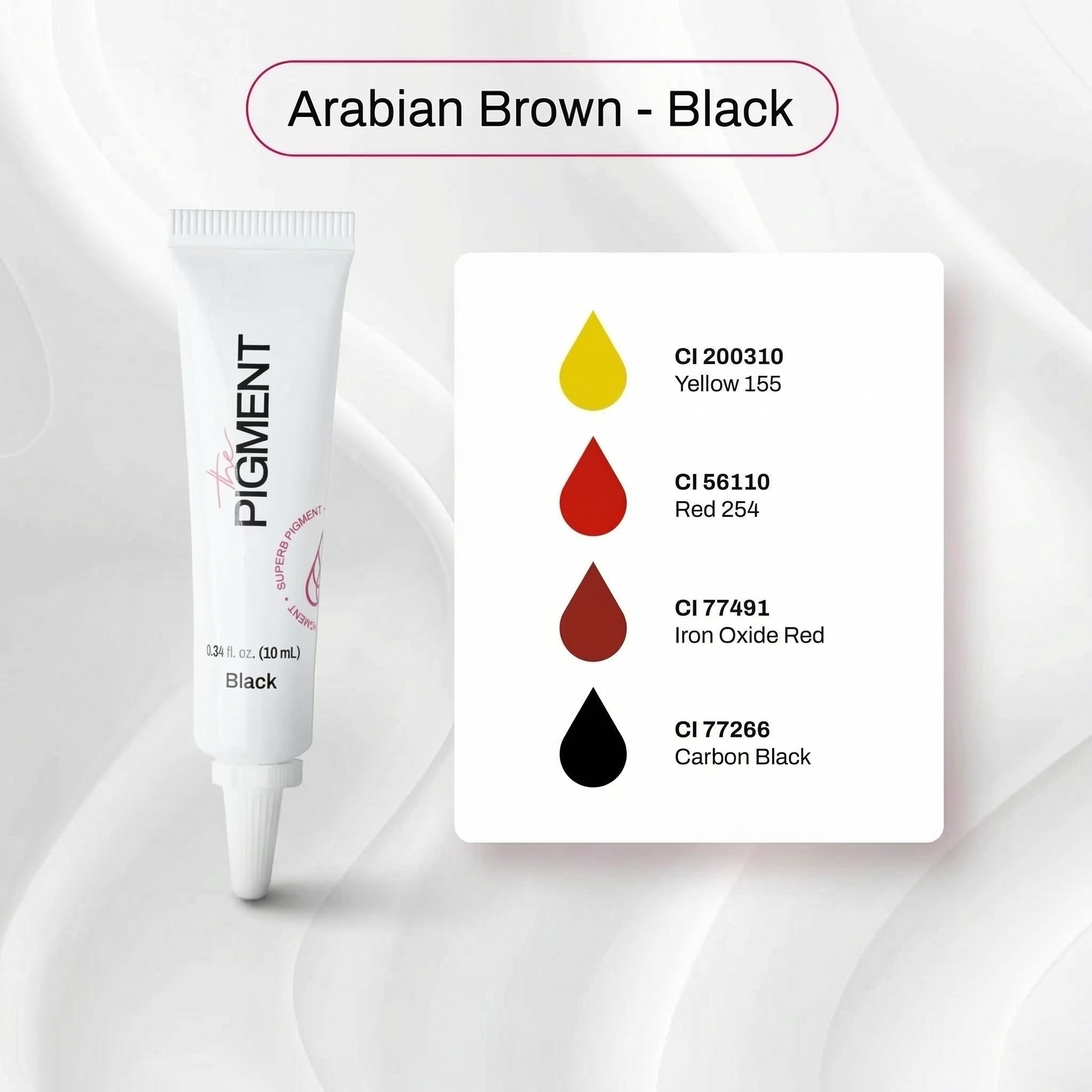 The Pigment Arabian Brown este o nuanță maro închis cu subton rece-neutru, concepută pentru artiști de microblading care urmăresc intensitate, claritate și stabilitate în timp.