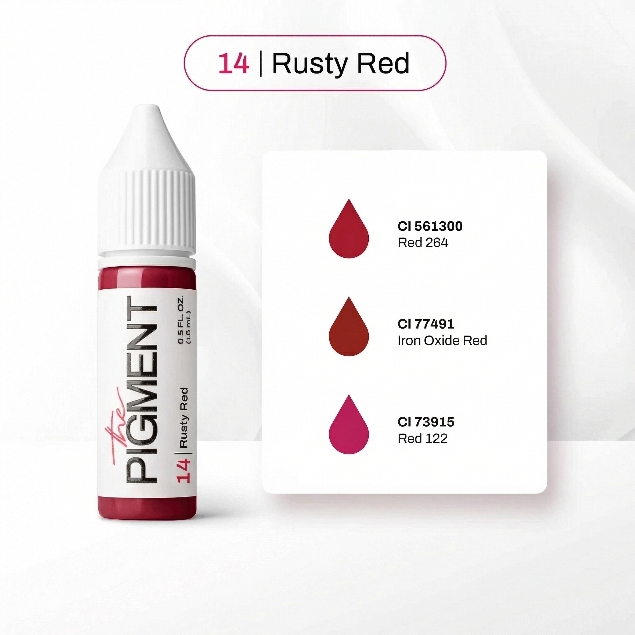 The Pigment 14 Rusty Red este o nuanță roșu ruginiu cu subton cald-teracotă, concepută pentru artiști PMU care doresc impact vizual, stabilitate și echilibru cromatic.