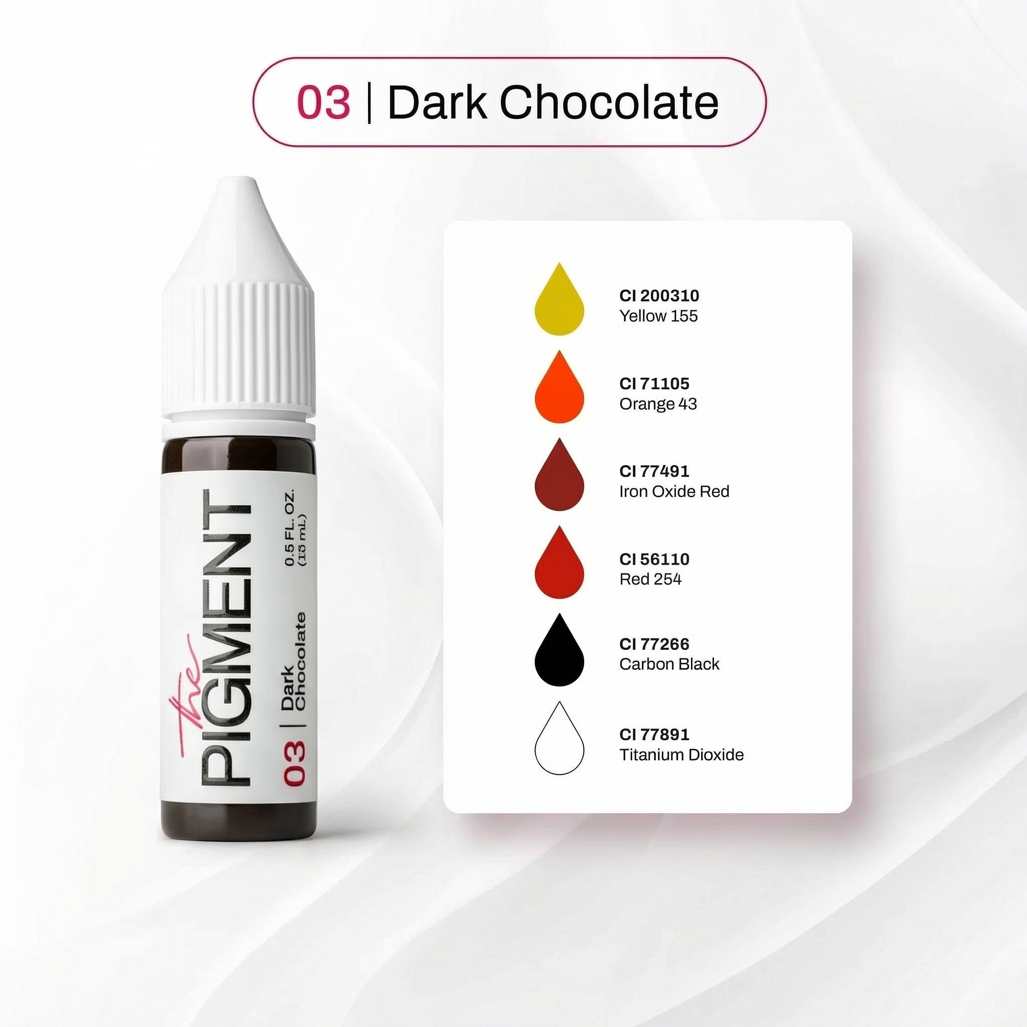 Dark Chocolate 03 din gama The Pigment este o nuanță profundă de maro ciocolatiu, dezvoltată pentru artiști PMU care urmăresc rezultate naturale, stabile și bine definite.